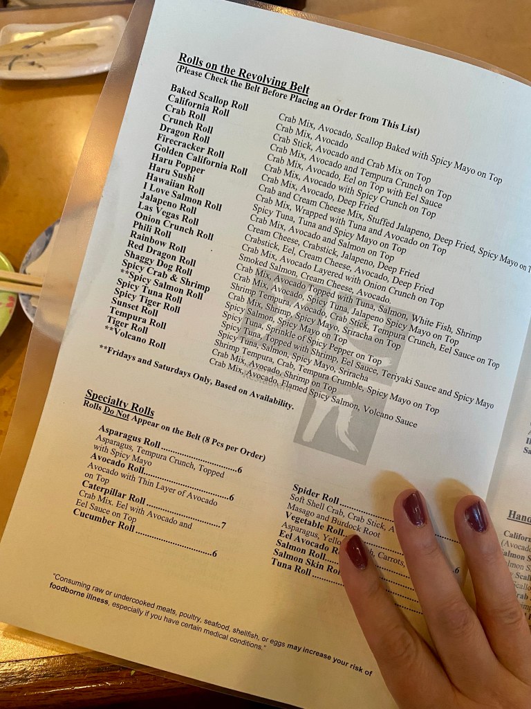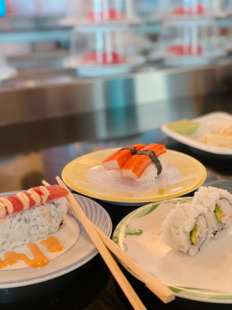 Sushi on a revolving conveyor belt. Five stars!! We are back for the second day in a row. The restaurant stays consistently full but never feels busy.